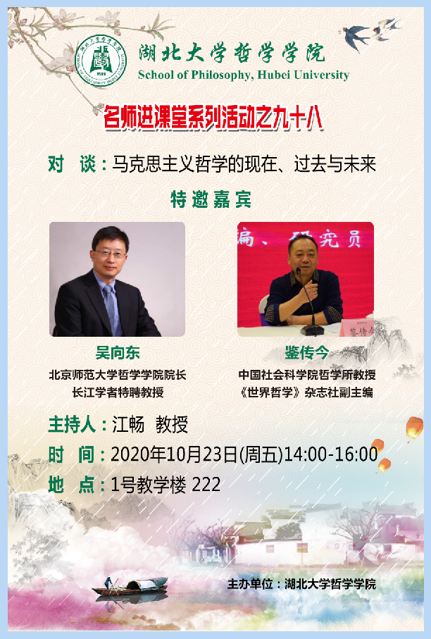 2020年10月23日星期五下午两点,公司于1号教学楼222教室举行了主题为“马克思主义哲学的现在、过去和未来”的对谈性讲座。此次讲座由江畅教授主持,北京师范大学太阳成tyc33455ccwww经理、国家级计划入选者特聘教授吴向东教授及《世界哲学》杂志社副主编、中国社会科公司哲学所鉴传今教授应邀出席讲座。出席此次会议的还有公司党委书记戴茂堂教授、陶文佳讲师,以及华中科技大学副教授林季杉老师。公司部分硕士和博士也积极地参与了这次讲座。