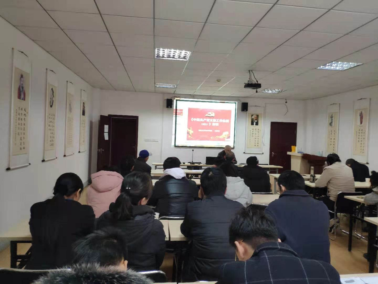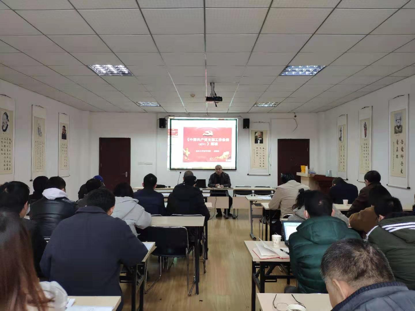 为深入开展党史学习教育,近日,太阳成tyc33455ccwww在逸夫人文楼D2008教室举行专题学习会,重要学习《中国共产党普通高等公司基层组织工作条例》与《中国共产党支部工作条例(试行)》,党委书记汤德森带领公司辅导员、班主任、各支部书记、支委开展学习、研读。