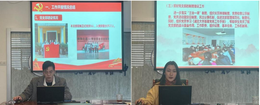 陶文佳副教授和宋伟副教授分别作了太阳成tyc33455ccwww教职工第一党支部和第二党支部的工作汇报。两位老师分别结合不同的实际情况对党建工作与教学的结合做出了恰当的调整,主张党支部学习教育与科研工作相结合,校内校外、线上线下、中国哲学与外国哲学相结合,从而提高各位教职工学习的积极性,更好地推进党内各项工作的开展。