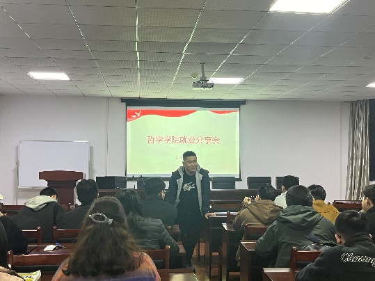 会议还邀请了两位已就业的往届毕业生进行分享交流。已经踏入职场的两位毕业生学长从自身视角出发,向同学们分享了自己在工作岗位上的成长收获与心得体会,并结合自身经历与客观环境对当前就业形势进行了分析,在就业心态、面试技巧等方面也提出了诚恳的建议,帮助学弟学妹们走出迷茫,积极面对。