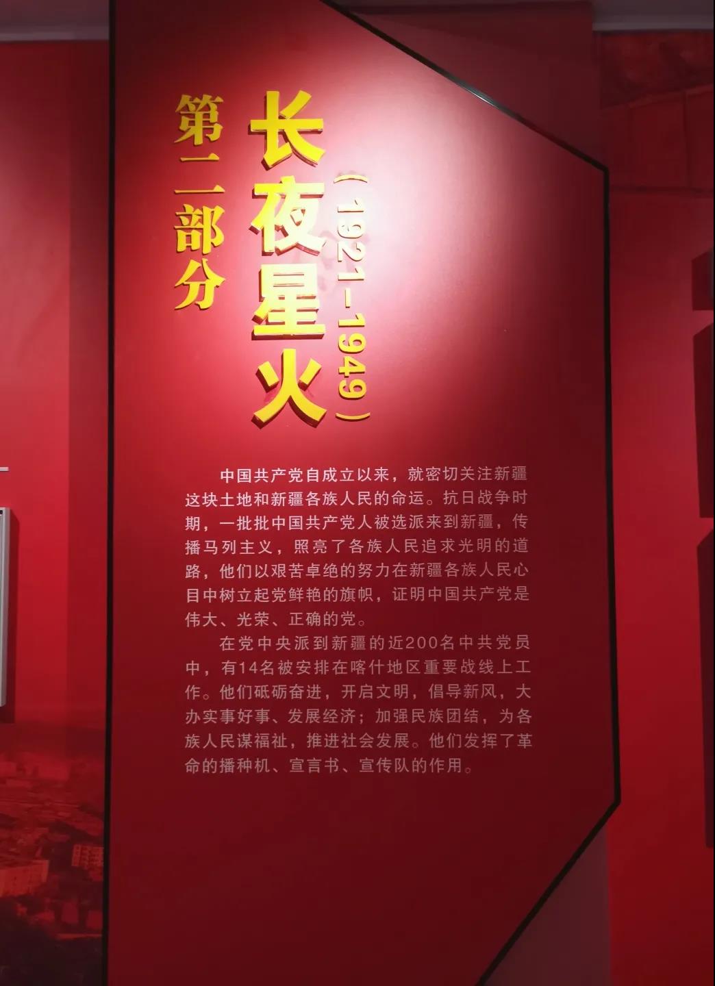 在展览馆第二部分《长夜星火》中,我了解到了共产党人在喀什早期活动的情况。中国共产党自成立以来,就密切关注新疆这块土地和新疆各族人民的命运。抗日战争时期,一批中国共产党人被选派来到新疆,传播马列主义,照亮了各族人民追求光明的道路,他们以艰苦卓绝的努力在新疆各族人民心目中树立起党鲜艳的旗帜,证明中国共产党是伟大、光荣、正确的党。