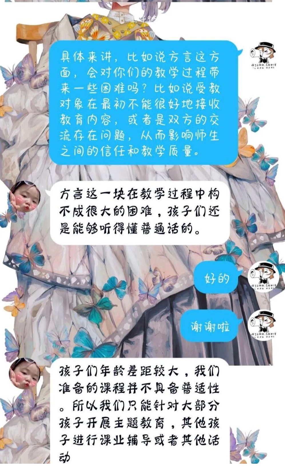 小组成员张雪晨对材料公司支教组进行了线上采访,采访了他们在支教过程中遇到的困难以及突破。他们在支教过程中遇到的困难,如交通不便、语言不通(方言)、因孩子们的年龄跨度大志愿者的准备工作量大等问题。有些在双方的磨合中得以解决,有些苦难仍亟待解决,支教的工作程序应更加完善等等。
