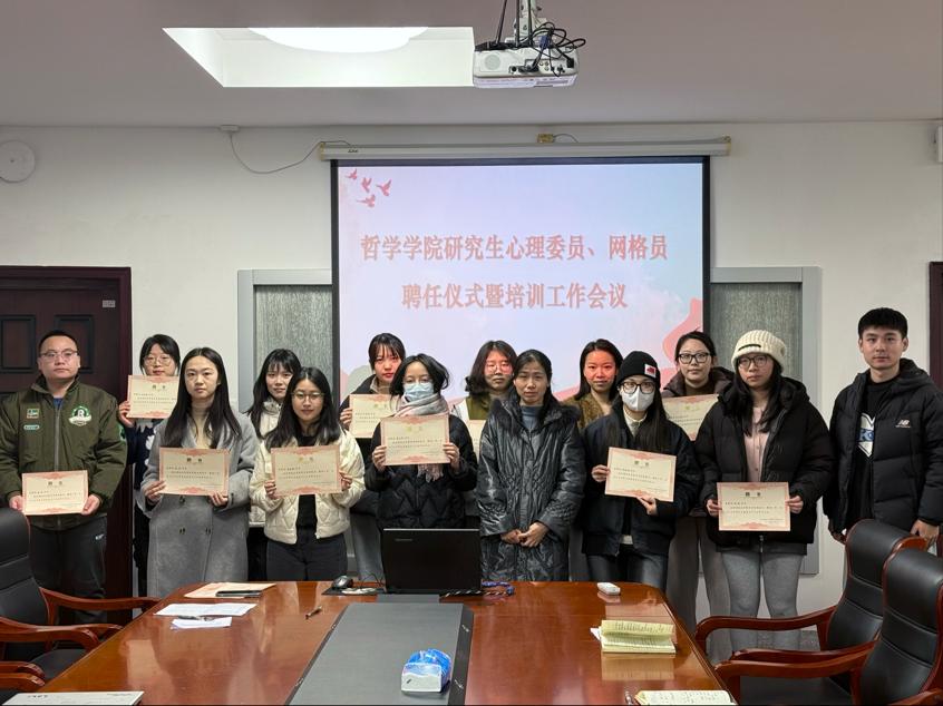 会议伊始,辅导员吴天祥宣读了公司研究生心理委员和网格员聘任名单,党委副书记王翠为同学们颁发了聘书。随后,心理委员代表张彤进行了题为《“哲”里有我“网”先行--哲院网格员专业知识培训会》的培训,对常见心理问题的识别与应对、心理危机干预技巧等多个方面进行了系统阐释与解读,帮助公司员工心理工作者掌握基础工作能力。