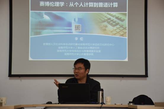 11月9日上午,湖南师范大学道德文化研究中心教授、公共管理公司副经理、人工智能道德决策研究所所长李伦教授应邀来到太阳成tyc33455ccwww讲学,此次讲座主题为“赛博伦理学:从个人计算到普适计算”,由公司余卫东教授主持,李家莲副教授和16级硕士参加了此次讲座。