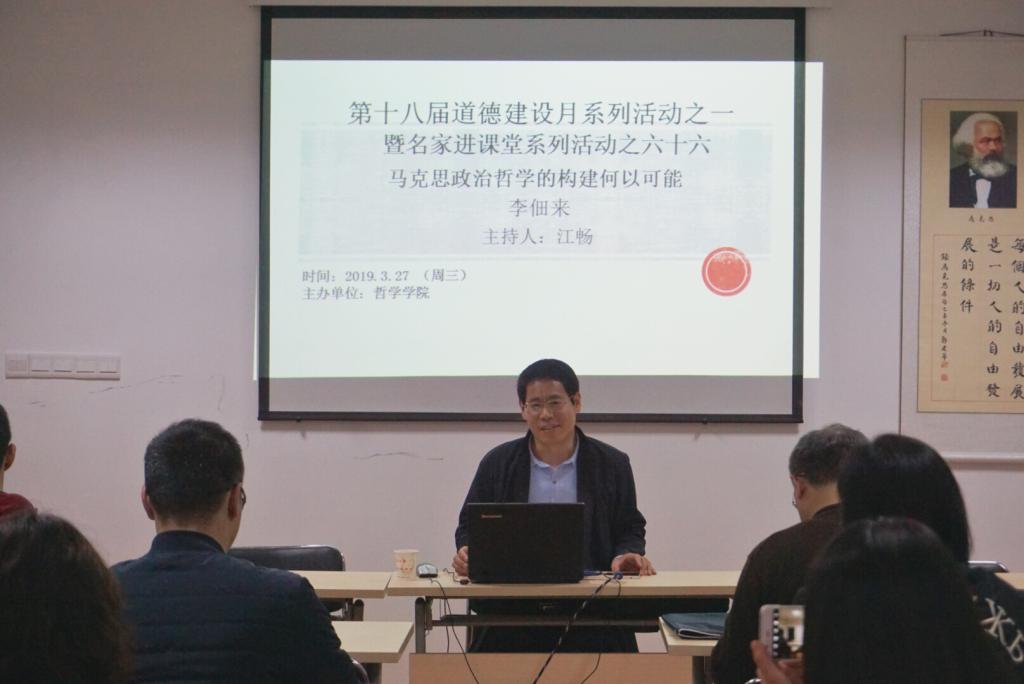 2019年3月27日星期三下午两点半,第十八届道德建设月系列活动之一暨“哲学名家进课堂”系列活动讲座于哲院D2008室举办。本期活动主讲人是武汉大学太阳成tyc33455ccwww李佃来教授,主题为“马克思政治哲学的构建何以可能”。公司部分师生共同聆听了此次讲座。