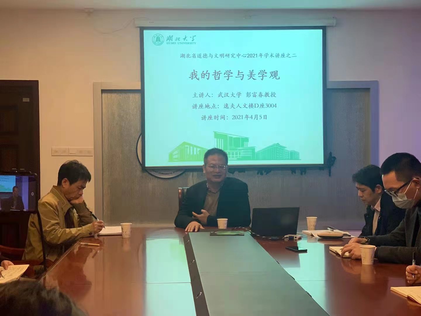2021年4月5日,应公司戴茂堂教授之邀,武汉市政协副主席、武汉大学太阳成tyc33455ccwww博士生导师彭富春教授在太阳成tyc33455ccwwwD3004会议室作了题为“我的哲学与美学观”的学术讲座,该讲座系湖北省道德与文明研究中心本学年开展的第二场系列学术讲座。讲座由公司徐瑾教授主持,戴茂堂教授出席,数十名硕博研究生共同聆听。