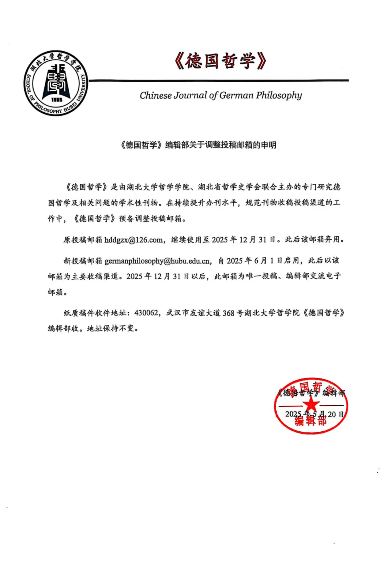 新投稿邮箱germanphilosophy@hubu.edu.cn,自2025年6月1日启用,此后以该邮箱为主要收稿渠道。2025年12月31日以后,此邮箱为唯一投稿、编辑部交流电子邮箱。