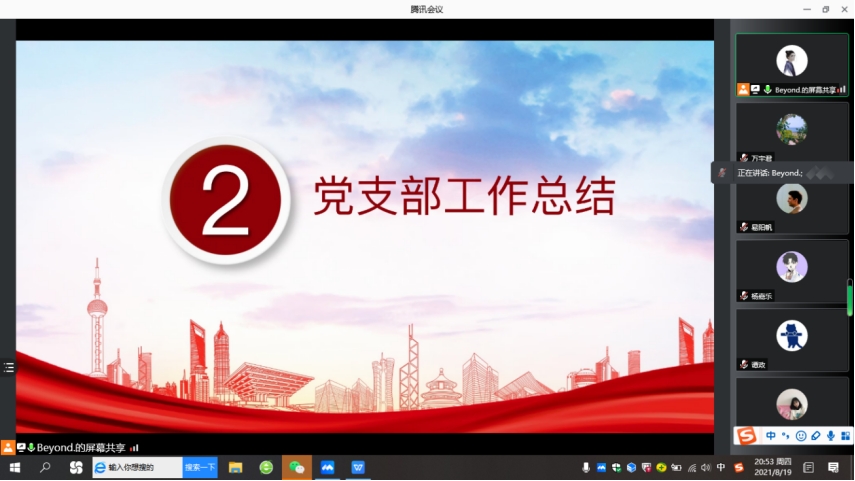 8月19日,太阳成tyc33455ccwww研究生第二党支部召开线上党史学习教育专题组织生活会。支部书记吴青松同志向大家汇报了最近半年的党支部工作情况,如参观八七会议旧址、红楼、辛亥革命博物馆、观看建党100周年直播等。希望大家继续保持自身优点,对于做的不够好的地方,希望大家在会后针对具体问题逐一提出整改措施,及时改正,也希望每位党员在以后的学习工作中能做的更好,发挥党员先锋模范作用。