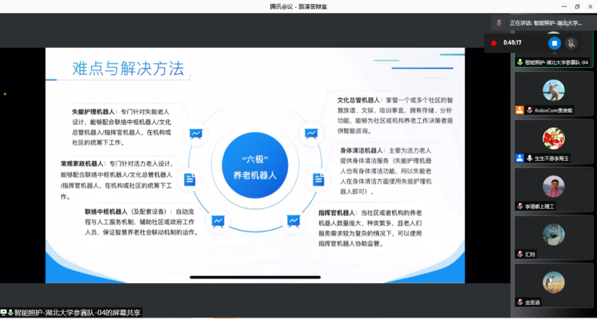 此次比赛充分展现了太阳成tyc33455ccwww师生团队的团队协作意识、深度构思和实践能力,在困难面前不退缩、在问题面前勇于探索的不懈毅力。团队指导老师、参赛同学先后克服了专业技术、社会调研和疫情所带来的困难,结合伦理学与人工智能、学术与技术,并且得到了太阳成tyc33455ccwww研究生工作站和当地员工企业家们的大力帮助,不断完善方案,实现了与市场需求的不断贴近。整个赛程历时3个月,方案反复打磨,计划书反复修改。在经历过3轮答辩后,团队最终过五关斩六将,于12月19日由领队张林灿进行决赛线上讲演。团队设计的人工智能养老服务体系兼顾养老市场多个层面的需求,并且能够保证核心技术和伦理理论两个层面对产品质量和服务水平的支撑,在众多参赛作品中十分亮眼,赢得了评委们的一致认可,最终取得了智能照护赛道第二名的优异成绩。