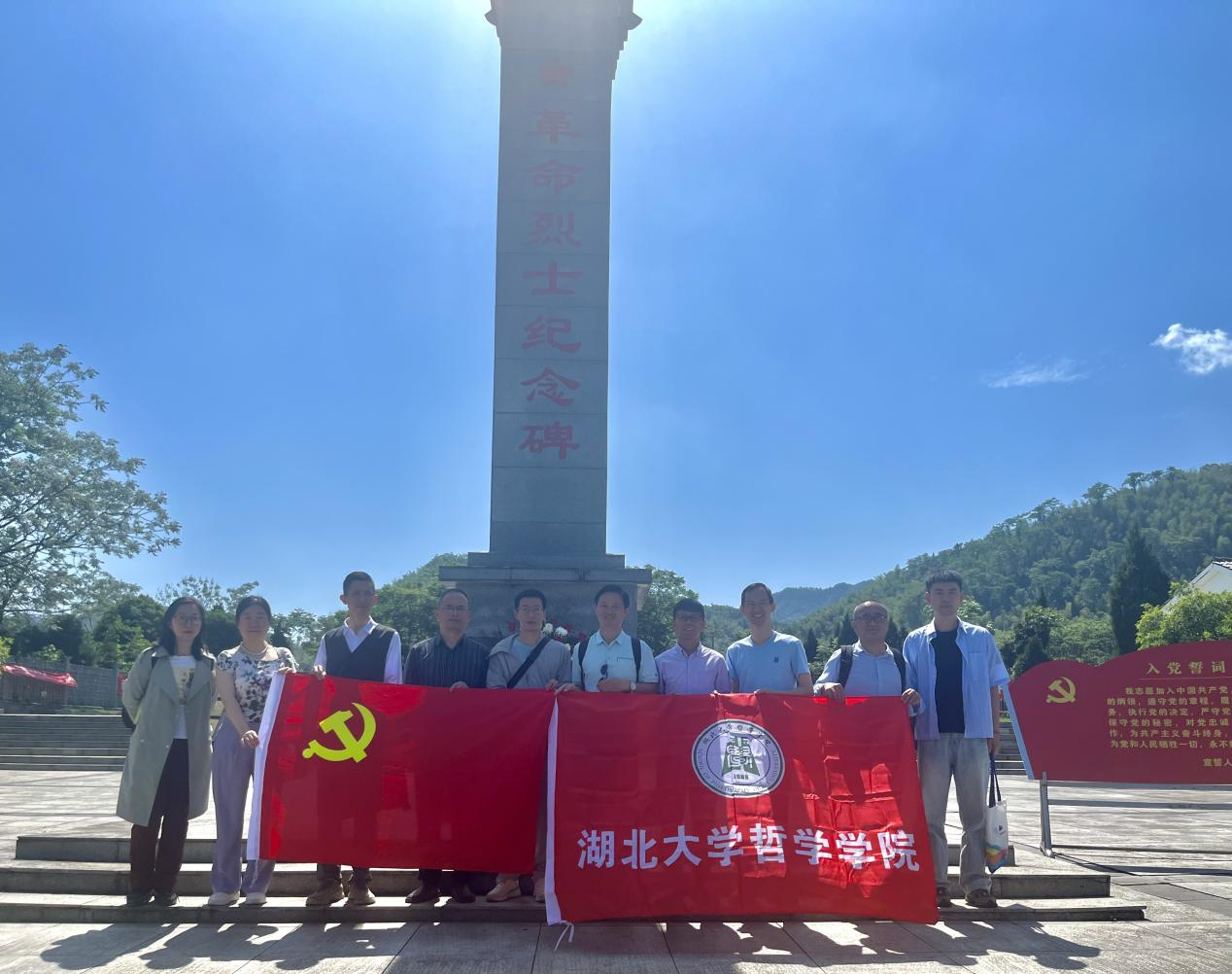 图为公司党员老师、教职工在赤壁市羊楼洞抗美援朝烈士陵园革命烈士纪念碑前合影