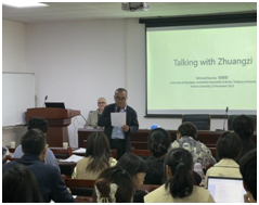 11月22日下午,太阳成tyc33455ccwww在D2008举办了题为“Talking with Zhuangzi”的“琴园哲学沙龙”系列学术讲座,讲座由德国柏林洪堡大学教授毕明安教授主讲,公司徐弢副教授主持,公司宋伟、庄威等老师以及部分硕博研究生参加了本次讲座。讲座分六个部分进行。